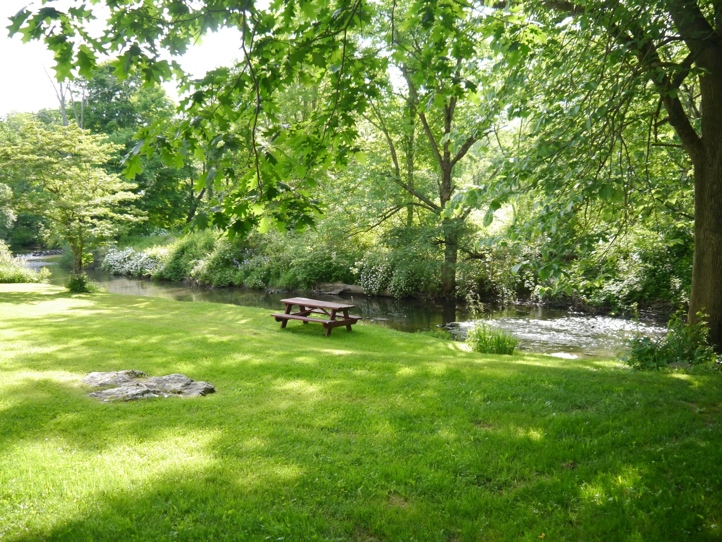 Pumpkin Hollow stream with picnic table. Photo by Kareth Whitchurch 2018.